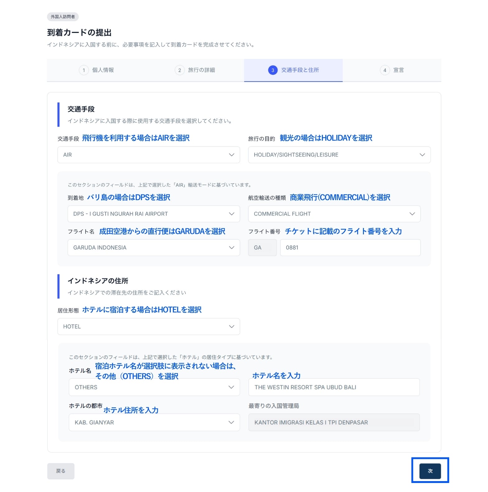 | 到着地 | 到着する空港名、バリ島の場合はDPSを選択 |