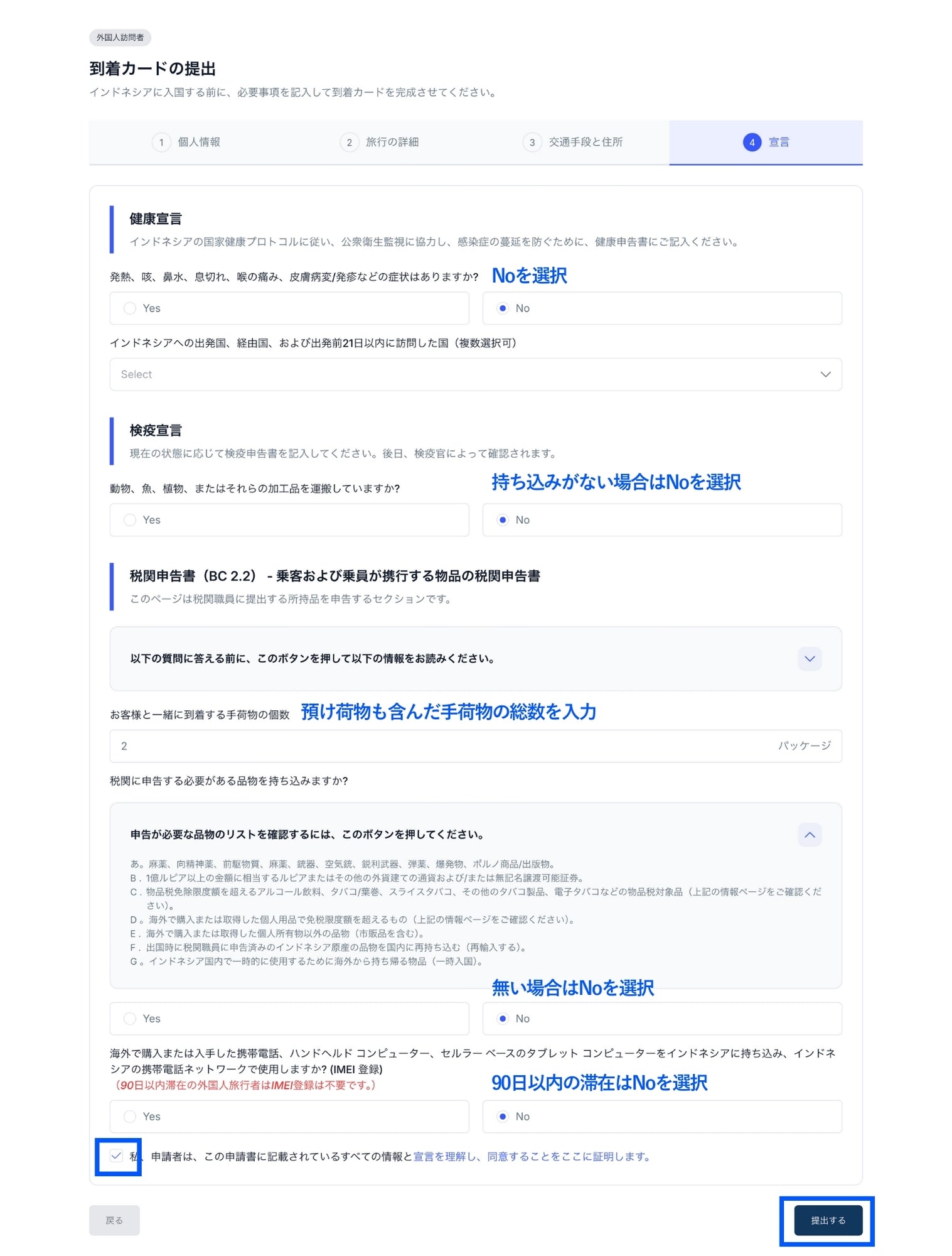 各種宣言と申告を入力後、証明にチェックを入れて「提出する」をクリッック